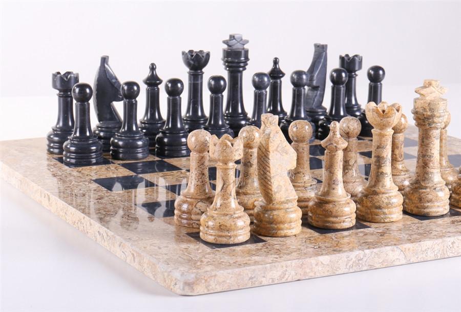 Marble chess sets will forever be heralded for their ancient and classic appeal. Some players enjoy the heavy feel of the marble pieces, while others adore their natural beauty. Marble chess sets are often enjoyed during games outdoors because they hold up to humidity or a breezy day. This fine marble chess set is 15" and is adorned with coral and black swirls and veins.
