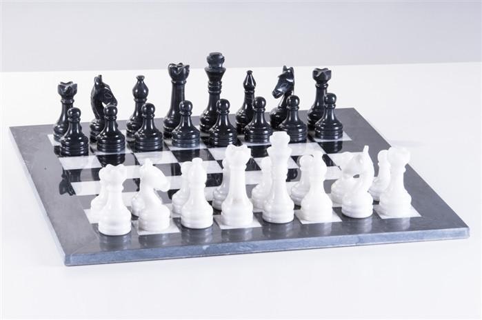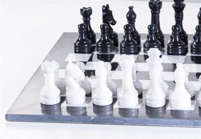 Vivid and eye-catching, the bold black and white marble veins wander naturally through the chessmen and chess board for an impressive presence in the home decor. It's stands ready for that occasional game between family or friends.