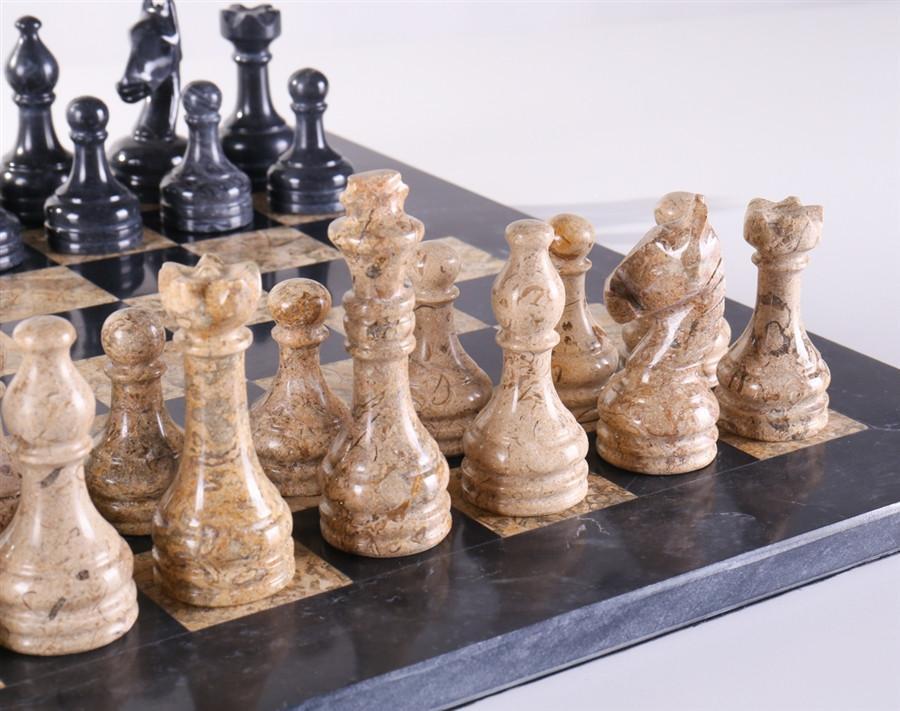 Vivid and eye-catching, the bold coral and black marble veins wander naturally through the chessmen and chess board for an impressive presence in the home decor. It's stands ready for that occasional game between family or friends.