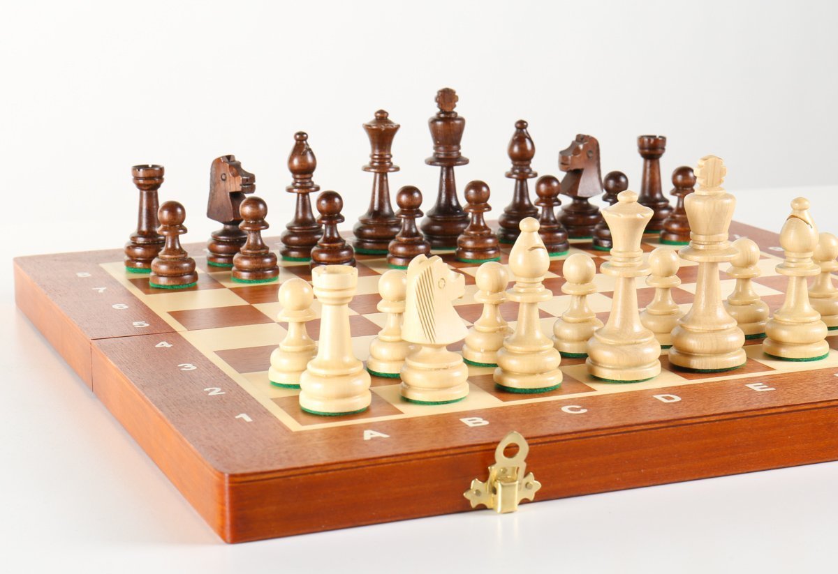 This mini classic tournament chess set is handcrafted in Europe from mahogany and sycamore woods with a beech and birchwood core.