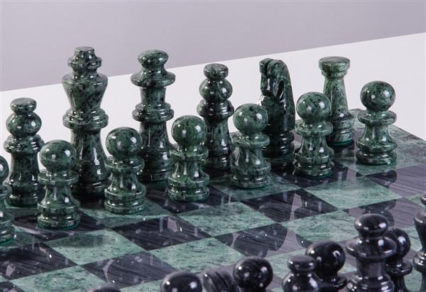 16" Marble Chess Set. Board itself is felted to prevent scratching table surface. Pieces have green felt. Green and Black pieces match board surface. This set is ideal as a family room display piece or for an occasional slow game of chess.