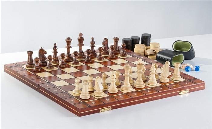 Made in Poland, this set features checkers, backgammon, dice and weighted felt-bottomed chess pieces.