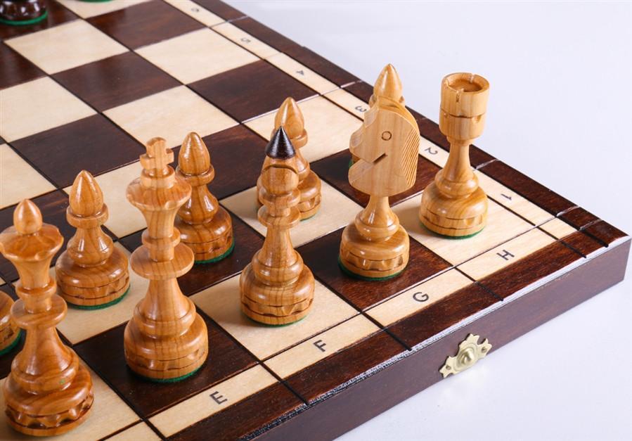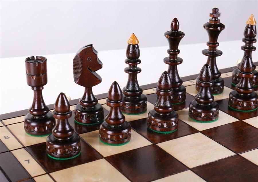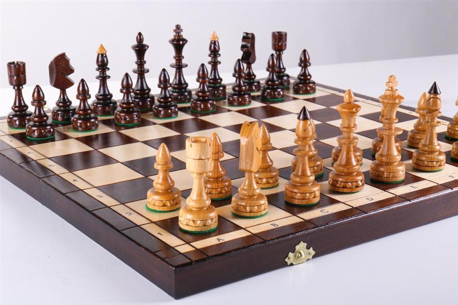 The Indian chess set is a high quality chess set made in Poland. It offers a distinctively Indian design with tall, slender pieces in contrasting black and medium woods. At 19" square it's relatively large and suitable for use at home or for decorative display. The board features coordinates rarely found on wood chess sets.