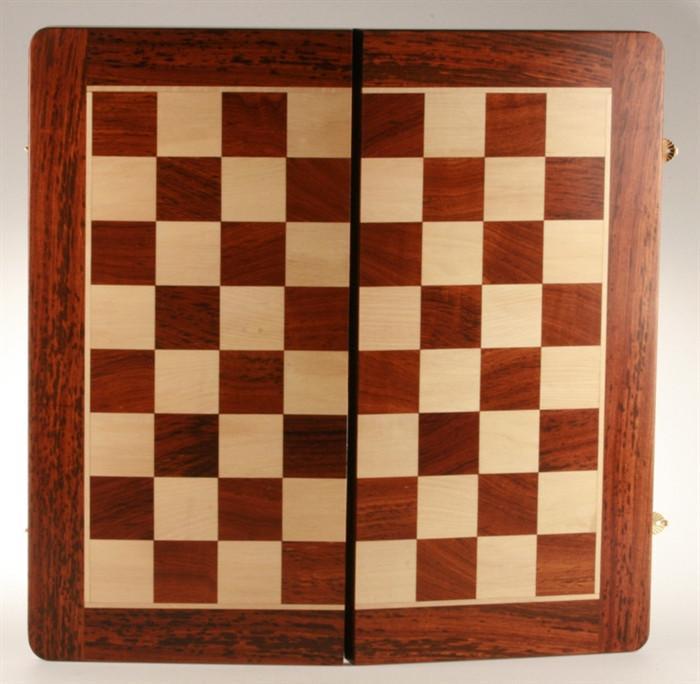 Furniture smooth finish, 20" folding chess piece storage box secures pieces individually. Handcrafted from from genuine golden rosewood and white maple. Natural wood grain is protected with a clear lacquer finish.