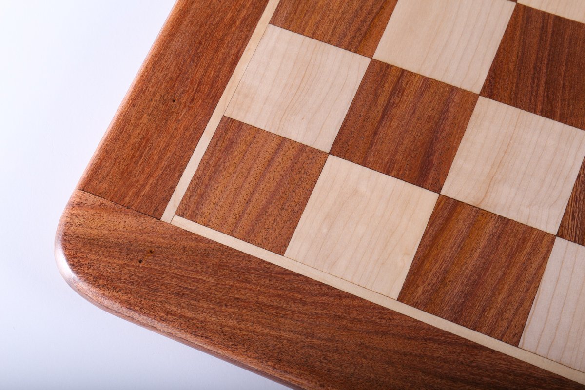 This striking 21" inch solid wood board with highly visible, "peppered" and streaked Acacia grain patterns, maple squares and border inlay is a solid choice at a great price.