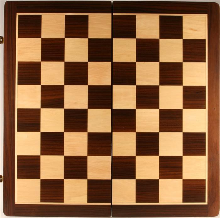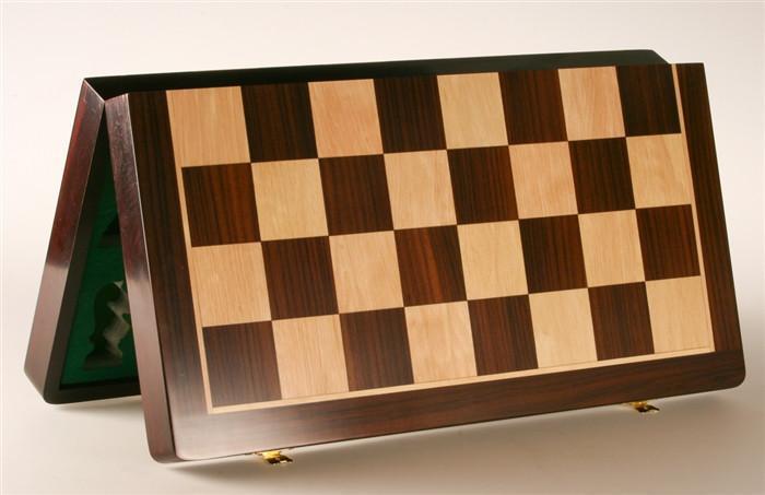 For most Staunton style chess pieces 3.75" to 4", this large rosewood chess board is the ideal playing and storage solution for extra mobility and compact storage.