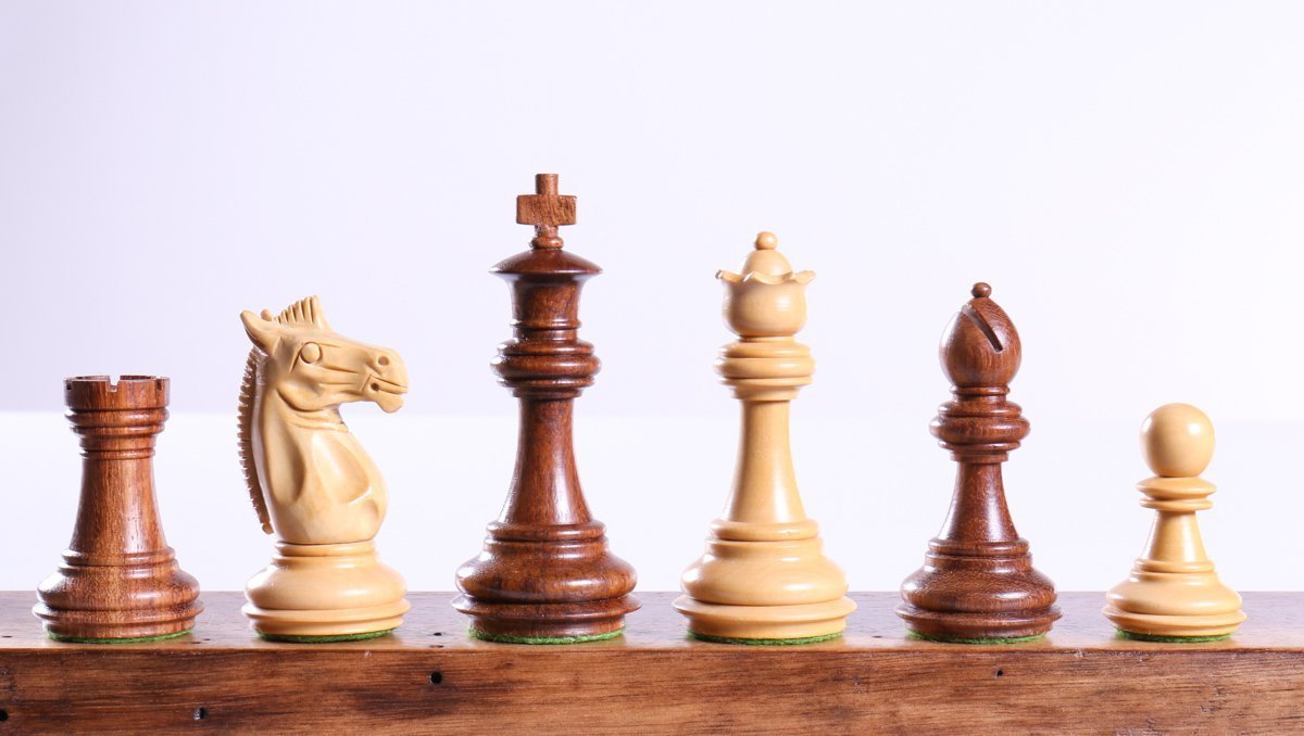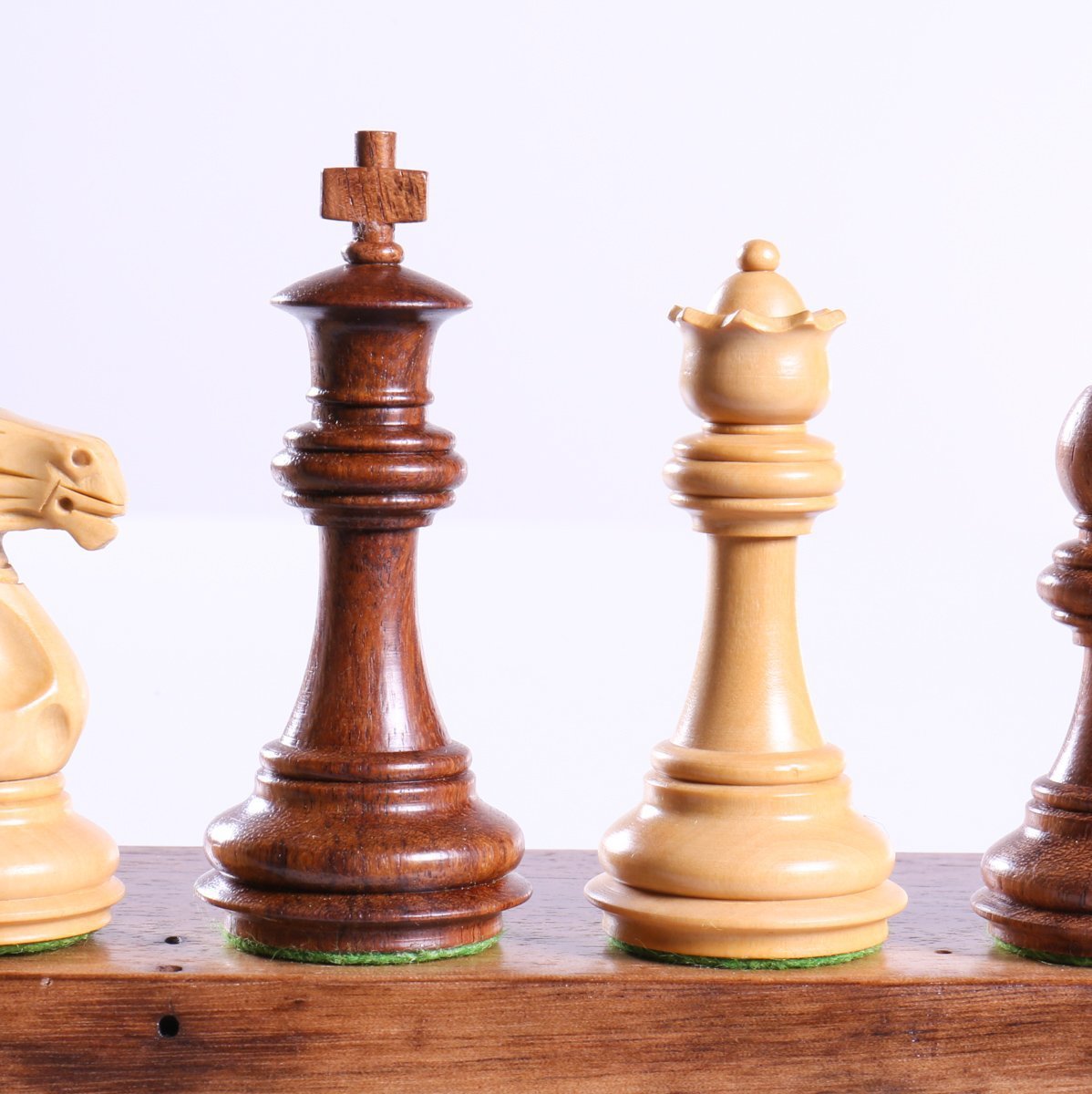 Unique, playable wooden chessmen carved from acacia and boxwood, two popular hardwoods ideal for chess pieces. Comes with extra queens and leather base pads to protect a chessboard surface.